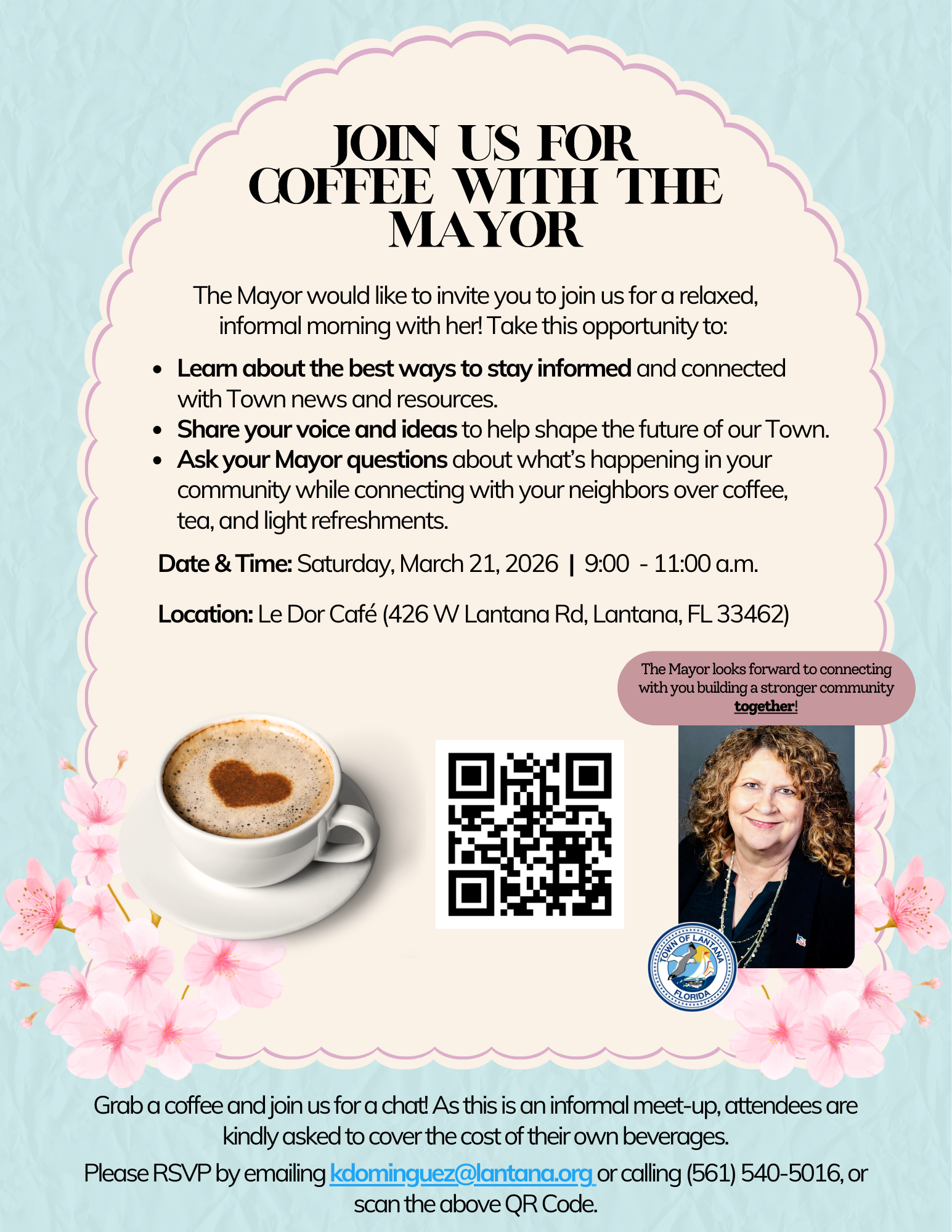 The Mayor invites residents to join her for a relaxed and informal morning of conversation and community connection. This gathering provides an opportunity to learn about ways to stay informed on Town news and resources, share ideas to help shape the future of the Town, and ask questions about matters affecting the community while connecting with neighbors.